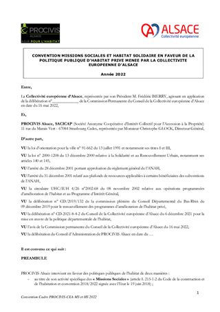 Le présent rapport a pour objet de proposer à la Commission Permanente du Conseil de la Collectivité européenne d’Alsace de décider de la reconduction du partenariat entre la Collectivité européenne d’Alsace et l'organisme PROCIVIS Alsace, au titre des "missions sociales" et du fonds "Habitat Solidaire" pour l’année 2022, pour le déclenchement du versement de l'avance des subventions départementales ou de prêts à 0% pour les bénéficiaires des aides départementales à la rénovation des logements et à l'adaptation des logements à la perte d'autonomie pour l’année 2022. Ces dispositions s'inscrivent dans le cadre de la mise en œuvre des dispositifs PIG Rénov'Habitat 67, Habiter Mieux 68, Soutien à l’Autonomie, ainsi que de la résorption de l'habitat précaire en faveur des nomades sédentarisés. Ce dispositif est un levier indispensable pour déclencher les travaux des ménages modestes : il évite en effet aux propriétaires occupants de faire l'avance du montant des aides de l'Agence Nationale de l'Habitat et de la Collectivité européenne d'Alsace et/ou permet de compléter un plan de financement.