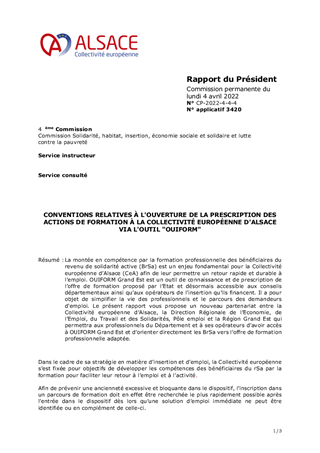 La montée en compétence par la formation professionnelle des bénéficiaires du revenu de solidarité active (BrSa) est un enjeu fondamental pour la Collectivité européenne d’Alsace (CeA) afin de leur permettre un retour rapide et durable à l’emploi. OUIFORM Grand Est est un outil de connaissance et de prescription de l’offre de formation proposé par l’Etat et désormais accessible aux conseils départementaux ainsi qu’aux opérateurs de l’insertion qu’ils financent. Il a pour objet de simplifier la vie des professionnels et le parcours des demandeurs d'emploi. Le présent rapport vous propose un nouveau partenariat entre la Collectivité européenne d’Alsace, la Direction Régionale de l’Economie, de l’Emploi, du Travail et des Solidarités, Pôle emploi et la Région Grand Est qui permettra aux professionnels du Département et à ses opérateurs d’avoir accès à OUIFORM Grand Est et d’orienter directement les BrSa vers l’offre de formation professionnelle adaptée.