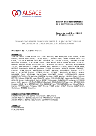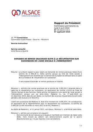 Le présent rapport a pour objet une demande de remise gracieuse totale d’une somme de 3 095,30 €. Cette somme perçue au titre de l’aide sociale à l’hébergement est réclamée par la Collectivité européenne d’Alsace dans le cadre de la procédure de récupération sur succession. Il est proposé d’accorder la remise gracieuse en totalité.
