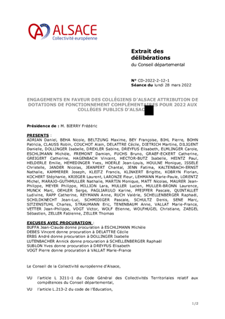 ENGAGEMENTS EN FAVEUR DES COLLÉGIENS D'ALSACE ATTRIBUTION DE DOTATIONS DE FONCTIONNEMENT COMPLÉMENTAIRES POUR 2022 AUX COLLÈGES PUBLICS D'ALSACE