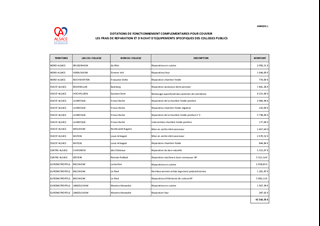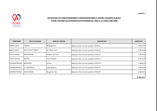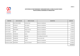 Le Bas-Rhin et le Haut-Rhin présentent des systèmes de dotations de fonctionnement aux collèges publics différents qui se poursuivront jusqu’à l’élaboration d’une nouvelle politique de dotation de fonctionnement, attendue pour le 1er janvier 2023. L’une des différences majeures réside dans le versement d’une dotation globale de fonctionnement (DGF) unique pour les collèges haut-rhinois et d’un versement de DGF assortie de dotations de fonctionnement complémentaires, au long cours, pour les collèges bas-rhinois. Ce rapport propose une série de dotations de fonctionnement complémentaires pour les collèges d'Alsace, notamment pour prendre en compte des corrections sur le nombre d’élève de référence, les effets de la crise sanitaire, les surcoûts des dépenses de viabilisation ainsi qu’une régularisation de répartition de charge de chauffage entre le Lycée et le Collège d’Ingersheim. Au total, 222 981,65 € sont ainsi identifiés et proposés dans ce rapport pour accompagner une partie des collèges d'Alsace.