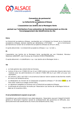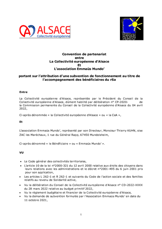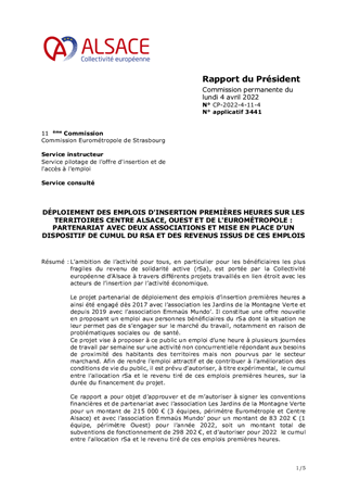 L’ambition de l’activité pour tous, en particulier pour les bénéficiaires les plus fragiles du revenu de solidarité active (rSa), est portée par la Collectivité européenne d’Alsace à travers différents projets travaillés en lien étroit avec les acteurs de l’insertion par l’activité économique. Le projet partenarial de déploiement des emplois d’insertion premières heures a ainsi été engagé dès 2017 avec l’association les Jardins de la Montagne Verte et depuis 2019 avec l’association Emmaüs Mundo’. Il constitue une offre nouvelle en proposant un emploi aux personnes bénéficiaires du rSa dont la situation ne leur permet pas de s’engager sur le marché du travail, notamment en raison de problématiques sociales ou de santé. Ce projet vise à proposer à ce public un emploi d’une heure à plusieurs journées de travail par semaine sur une activité non concurrentielle répondant aux besoins de proximité des habitants des territoires mais non pourvus par le secteur marchand. Afin de rendre l'emploi attractif et de contribuer à l'amélioration des conditions de vie du public, il est prévu d'autoriser, à titre expérimental, le cumul entre l'allocation rSa et le revenu tiré de ces emplois premières heures, sur la durée du financement du projet. Ce rapport a pour objet d’approuver et de m’autoriser à signer les conventions financières et de partenariat avec l’association Les Jardins de la Montagne Verte pour un montant de 215 000 € (3 équipes, périmètre Eurométrople et Centre Alsace) et avec l’association Emmaüs Mundo’ pour un montant de 83 202 € (1 équipe, périmètre Ouest) pour l’année 2022, soit un montant total de subventions de fonctionnement de 298 202 €, et d'autoriser pour 2022 le cumul entre l'allocation rSa et le revenu tiré de ces emplois premières heures.