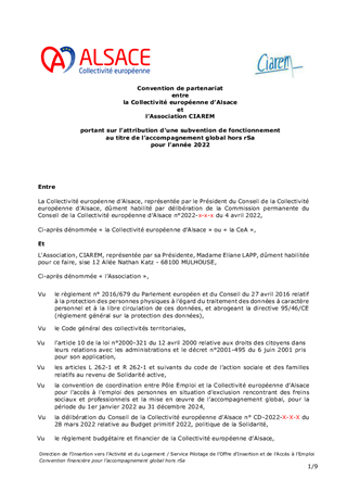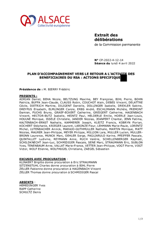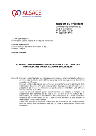 Dans un objectif de lutte contre la pauvreté, le retour à l’emploi des bénéficiaires du revenu de Solidarité active (BrSa) est une priorité absolue pour la Collectivité européenne d’Alsace. Dans un contexte de reprise économique, il convient d’assurer la continuité de la mobilisation du public afin qu’il puisse profiter des opportunités d’emploi qui se présentent et donner les moyens aux partenaires de maintenir une offre de service adaptée et réactive. Aussi, le présent rapport porte essentiellement sur l’accès à l’emploi : la préparation des bénéficiaires du rSa à un exercice dans le secteur de la restauration, le soutien au recrutement des employeurs et la mise en relation soutenue des bénéficiaires du rSa - demandeurs d’emploi et des projets de mobilisation socio-professionnels. Il est ainsi proposé d’autoriser l’attribution de subventions de fonctionnement pour ces actions pour un montant total de 375 122 € et de valider les conventions afférentes.