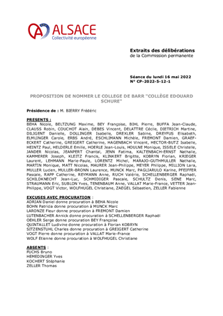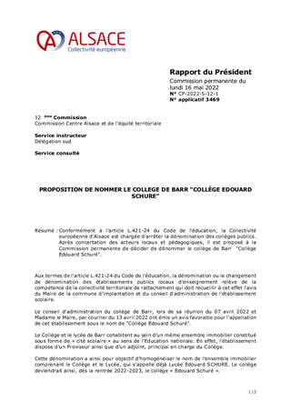 Conformément à l'article L.421-24 du Code de l'éducation, la Collectivité européenne d'Alsace est chargée d'arrêter la dénomination des collèges publics. Après concertation des acteurs locaux et pédagogiques, il est proposé à la Commission permanente de décider de dénommer le collège de Barr "Collège Edouard Schuré".