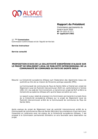 La Collectivité européenne d’Alsace suit l’élaboration des règlements locaux de publicité au titre de sa mission de Personne publique associée (PPA). La Communauté de communes du Pays de Sainte Odile a finalisé son projet de Règlement Local de Publicité intercommunal (RLPi) et, conformément à l'article L581-14-1 du code de l’environnement, a transmis son projet de RLPi arrêté à la Collectivité européenne d’Alsace afin qu’elle fasse connaître son avis. Le rapport a pour objet de proposer à la Commission permanente le projet d’avis de la Collectivité européenne d’Alsace sur le projet de Règlement Local de Publicité intercommunal arrêté de la Communauté de communes du Pays de Sainte Odile.