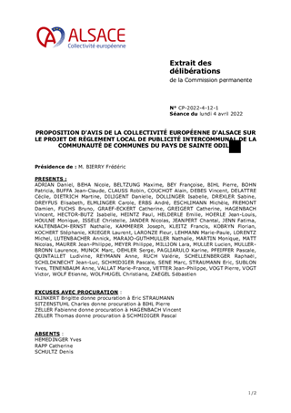 PROPOSITION D'AVIS DE LA COLLECTIVITÉ EUROPÉENNE D'ALSACE SUR LE PROJET DE RÈGLEMENT LOCAL DE PUBLICITÉ INTERCOMMUNAL DE LA COMMUNAUTÉ DE COMMUNES DU PAYS DE SAINTE ODILE