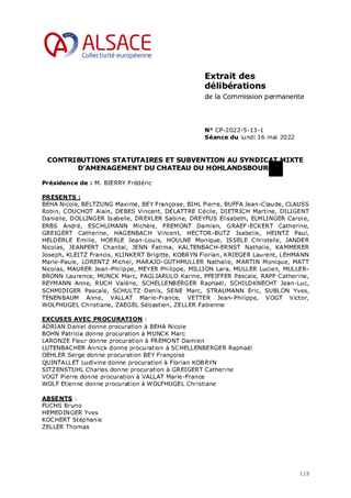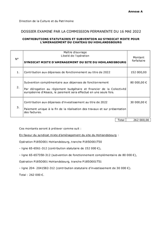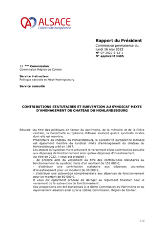 Au titre des politiques en faveur du patrimoine, de la mémoire et de la filière castrale, la Collectivité européenne d’Alsace soutient quatre syndicats mixtes dont elle est membre. Propriétaire du château du Hohlandsbourg, la Collectivité européenne d’Alsace est également membre du syndicat mixte d’aménagement du château du Hohlandsbourg créé en 1987. Les statuts du syndicat mixte prévoient le versement d’une contribution annuelle aux dépenses de fonctionnement ainsi qu’aux dépenses d’investissement. Au titre de 2022, il vous est proposé : - de prendre acte du versement au titre des contributions statutaires au fonctionnement du syndicat mixte d’un montant de 152 000 €, - d’attribuer une contribution statutaire aux dépenses courantes d’investissement pour un montant de 30 000 €, - d’attribuer une subvention complémentaire aux dépenses de fonctionnement pour un montant de 80 000 €. Il vous est également proposé de déroger au règlement financier pour le versement de la subvention de fonctionnement. Ces propositions ont été transmises à la 6ème Commission du Patrimoine et du rayonnement alsacien ainsi qu’à la 13ème Commission, Région de Colmar.