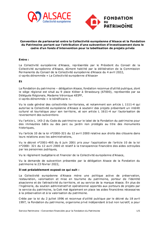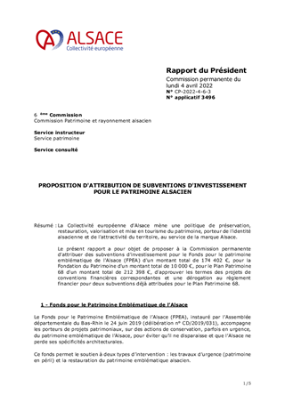 La Collectivité européenne d'Alsace mène une politique de préservation, restauration, valorisation et mise en tourisme du patrimoine, porteur de l'identité alsacienne et de l'attractivité du territoire, au service de la marque Alsace. Le présent rapport a pour objet de proposer à la Commission permanente d'attribuer des subventions d'investissement pour le Fonds pour le patrimoine emblématique de l'Alsace (FPEA) d'un montant total de 174 402 €, pour la Fondation du Patrimoine d'un montant total de 10 000 €, pour le Plan Patrimoine 68 d'un montant total de 212 398 €, d'approuver les termes des projets de conventions financières correspondantes et une dérogation au règlement financier pour deux subventions déjà attribuées pour le Plan Patrimoine 68.