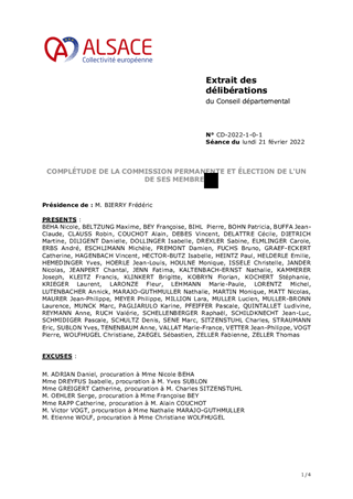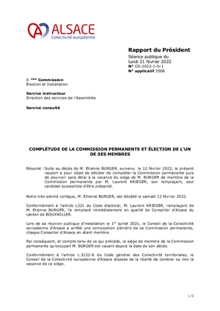Suite au décès de M. Etienne BURGER, survenu le 12 février 2022, le présent rapport a pour objet de décider de compléter la Commission permanente puis de pourvoir sans délai à la vacance du siège de M. BURGER de membre de la Commission permanente par M. Laurent KRIEGER, son remplaçant, seul candidat susceptible d’être présenté.