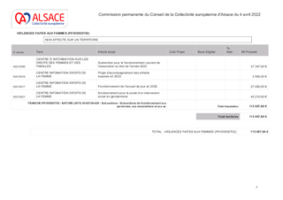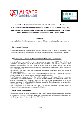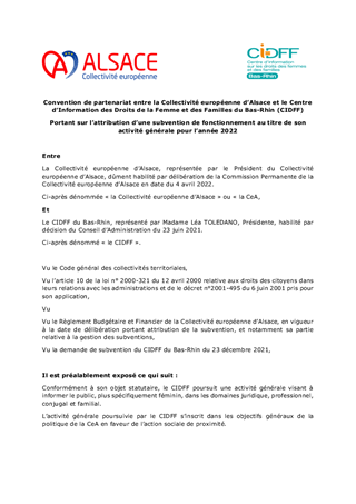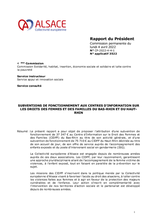 Le présent rapport a pour objet de proposer l’attribution d’une subvention de fonctionnement de 37 347 € au Centre d’Information sur le Droit des Femmes et des Familles (CIDFF) du Bas-Rhin au titre de son activité générale, et d'une subvention de fonctionnement de 75 710 € au CIDFF du Haut-Rhin déclinée au titre de son accueil de jour, de son offre de service auprès de l’accompagnement des enfants exposés et du poste d’intervenant social en gendarmerie (ISG). La Collectivité européenne d’Alsace est engagée depuis de nombreuses années auprès de ces deux associations. Les CIDFF, par leur rayonnement, garantissent une approche pluridisciplinaire allant de l’accompagnement de la femme victime de violences, à l’enfant exposé, tout en faisant en parallèle de la prévention sur le sujet. Les missions des CIDFF s’inscrivent dans la politique menée par la Collectivité européenne d’Alsace visant à favoriser l’accès au droit des alsaciens, à lutter contre les violences faites aux femmes et à agir en faveur de la protection des majeurs vulnérables et de l’enfance. Leur action s’inscrit en complémentarité avec l’intervention de nos territoires d’action sociale et le partenariat est développé depuis de nombreuses années.