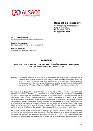 Le présent rapport a pour objet d’approuver les termes de la convention à conclure avec la Ville de MULHOUSE dans le cadre de l’exécution des travaux de gros et petit entretien des RD situées en traverse de l’agglomération mulhousienne et de fixer la participation forfaitaire annuelle de la Collectivité européenne d’Alsace à hauteur de 181 113 € TTC, révisable annuellement.