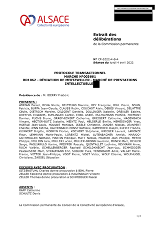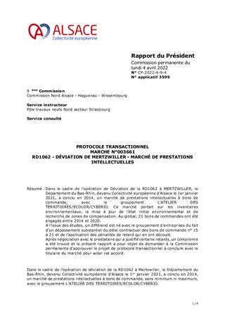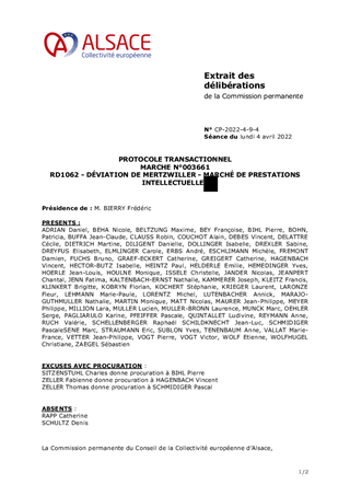 Dans le cadre de l’opération de Déviation de la RD1062 à MERTZWILLER, le Département du Bas-Rhin, devenu Collectivité européenne d’Alsace le 1er janvier 2021, a conclu en 2014, un marché de prestations intellectuelles à bons de commande, avec le groupement L’ATELIER DES TERRITOIRES/ECOLOR/CYBERIO. Ce marché portait sur les inventaires environnementaux, la mise à jour de l’état initial environnemental et de recherche de zones de compensation. Au global, 21 bons de commandes ont été engagés entre 2014 et 2020. A l’issue des études, un différend est né avec le groupement d’entreprises du fait d’un dépassement substantiel du délai contractuel des bons de commande n° 15 à 21 et de l’application des pénalités de retard qui en ont découlé. Après négociation avec le prestataire qui a justifié certains retards, un compromis a été trouvé et le présent rapport a pour objet de demander à la Commission permanente d'approuver le projet de protocole transactionnel à conclure avec le titulaire du marché pour acter cet accord.