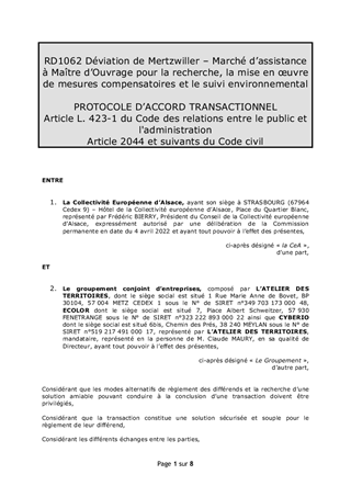 PROTOCOLE TRANSACTIONNEL MARCHE N°003661 RD1062 - DÉVIATION DE MERTZWILLER - MARCHÉ DE PRESTATIONS INTELLECTUELLES
