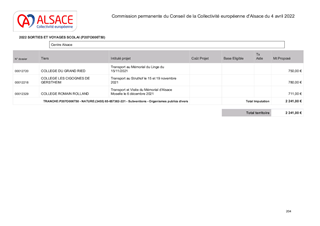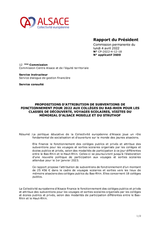 La politique éducative de la Collectivité européenne d’Alsace joue un rôle fondamental de socialisation et d'ouverture sur le monde des jeunes alsaciens. Elle finance le fonctionnement des collèges publics et privés et attribue des subventions pour les voyages et sorties scolaires organisés par les collèges et écoles publics et privés, selon des modalités de participation à ce jour différentes entre le Bas-Rhin et le Haut-Rhin. Celles-ci se poursuivront jusqu’à l’élaboration d’une nouvelle politique de participation aux voyages et sorties scolaires attendue pour le 1er janvier 2023. Ce rapport propose l’attribution de subventions de fonctionnement d’un montant de 25 456 € dans le cadre de voyages scolaires et sorties vers les lieux de mémoire alsaciens des collèges publics du Bas-Rhin. Elles concernent 18 collèges publics.