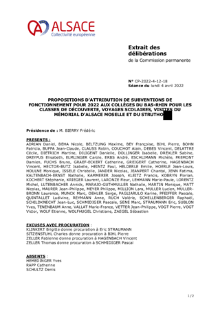 PROPOSITIONS D'ATTRIBUTION DE SUBVENTIONS DE FONCTIONNEMENT POUR 2022 AUX COLLÈGES DU BAS-RHIN POUR LES CLASSES DE DÉCOUVERTE, VOYAGES SCOLAIRES, VISITES DU MÉMORIAL D'ALSACE MOSELLE ET DU STRUTHOF