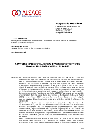 ABATTOIR DE PROXIMITE A CERNAY INVESTISSEMENTS ET GROS TRAVAUX 2022, PROLONGATION DE LA DSP
