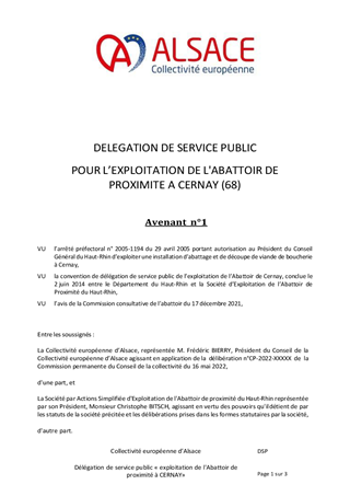 La Collectivité soutient l’agriculture à hauteur d’environ 7 M€ en 2022, avec des interventions dans les domaines de l’agriculture durable, de l’aménagement foncier, de l’aménagement de l’espace rural et forestier et de la santé animale. L'abattoir de proximité à CERNAY est un outil majeur de cette politique volontariste de la Collectivité, en faveur à la fois de la filière et des circuits courts, visant à soutenir une agriculture durable bien intégrée dans ses territoires d’élevage, préservant ainsi les surfaces en herbe, protégeant la ressource en eau en limitant les intrants dans le sol et la nappe et en favorisant la biodiversité. Le fonctionnement de l'abattoir de proximité à CERNAY est assuré par une société d'exploitation dans le cadre d'une convention de Délégation de Service Public (DSP) renouvelée en 2014 pour une durée de 8 ans. Cette convention stipule que les travaux d'investissements et de gros entretien sont à la charge de la collectivité. Lors de la réunion de la commission consultative de l'abattoir du 17 décembre 2021, il a été acté de concentrer les investissements 2022 sur les travaux d’extension et de modernisation (agrandissement des locaux administratifs, agrandissement des capacités frigorifiques et de l’atelier de découpe, ajout d’un atelier de fabrication), sur le renouvellement et la mise aux normes de certains équipements (hygiène et sécurité…) et néanmoins de réaliser en 2022 les travaux de gros entretien qui sont nécessaires pour un montant total de 40 000 €. Cette convention de DSP arrive à son terme en juin 2022 et devra être renouvelée pour permettre la continuité du service public. Les travaux d’extension et de modernisation étaient censés être réceptionnés avant le terme de l’actuelle DSP pour permettre au prochain délégataire de débuter son exploitation dans des locaux dont les travaux auraient été achevés. Or, ces travaux, qui devaient initialement débuter en septembre 2021 et se terminer au mois de mai 2022, ne vont pouvoir commencer qu’en mai 2022. Le présent rapport propose à la Commission permanente, d’une part, d’approuver, pour l’année 2022, les dépenses d’investissement et de gros entretien de la Collectivité européenne d’Alsace en tant que propriétaire de l’Abattoir de Cernay et, d’autre part, d’approuver l’avenant n°1 à la convention de délégation de service public de l’abattoir portant prorogation à la date du 31 mars 2023 du terme de l’actuelle délégation initialement fixé au 19 juin 2022, afin de permettre au futur délégataire de prendre possession d’un outil pleinement opérationnel et dont les travaux seront alors achevés.