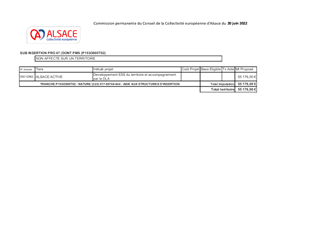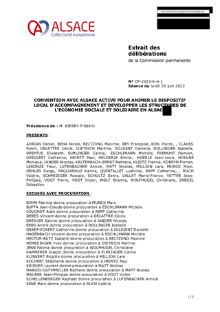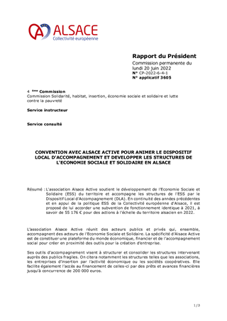 L'association Alsace Active soutient le développement de l'Economie Sociale et Solidaire (ESS) du territoire et accompagne les structures de l'ESS par le Dispositif Local d'Accompagnement (DLA). En continuité des années précédentes et en appui de la politique ESS de la Collectivité européenne d'Alsace, il est proposé de lui accorder une subvention de fonctionnement identique à 2021, à savoir de 55 176 € pour des actions à l'échelle du territoire alsacien en 2022.