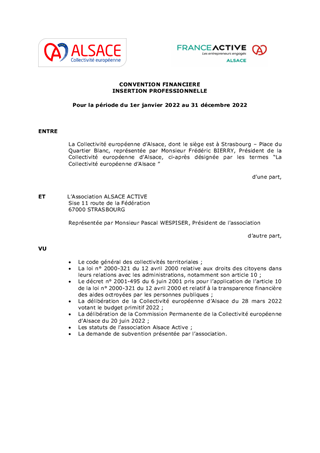 CONVENTION AVEC ALSACE ACTIVE POUR ANIMER LE DISPOSITIF LOCAL D'ACCOMPAGNEMENT ET DEVELOPPER LES STRUCTURES DE L'ECONOMIE SOCIALE ET SOLIDAIRE EN ALSACE