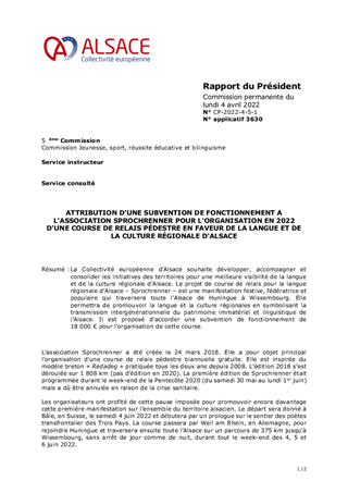 La Collectivité européenne d’Alsace souhaite développer, accompagner et consolider les initiatives des territoires pour une meilleure visibilité de la langue et de la culture régionale d’Alsace. Le projet de course de relais pour la langue régionale d’Alsace – Sprochrenner – est une manifestation festive, fédératrice et populaire qui traversera toute l’Alsace de Huningue à Wissembourg. Elle permettra de promouvoir la langue et la culture régionales en symbolisant la transmission intergénérationnelle du patrimoine immatériel et linguistique de l’Alsace. Il est proposé d'accorder une subvention de fonctionnement de 18 000 € pour l'organisation de cette course.