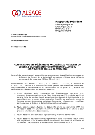 Le présent rapport a pour objet de rendre compte des délégations accordées au Président du Conseil de la Collectivité européenne d'Alsace dans différents domaines du 1er novembre 2021 au 30 avril 2022.