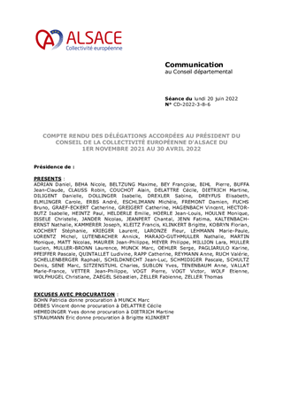 COMPTE RENDU DES DÉLÉGATIONS ACCORDÉES AU PRÉSIDENT DU CONSEIL DE LA COLLECTIVITÉ EUROPÉENNE D'ALSACE DU 1ER NOVEMBRE 2021 AU 30 AVRIL 2022