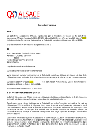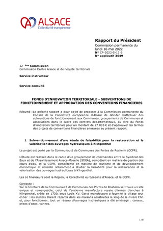 Le présent rapport a pour objet de proposer à la Commission permanente du Conseil de la Collectivité européenne d'Alsace de décider d'attribuer des subventions de fonctionnement aux Communes, groupements de Communes et associations dans le cadre des contrats départementaux, au titre du Fonds d'innovation territoriale pour un montant de 27 005 € et d'approuver les termes des projets de conventions financières annexées au présent rapport.