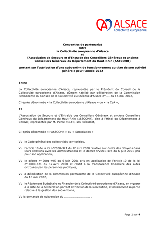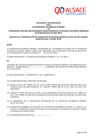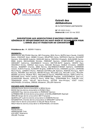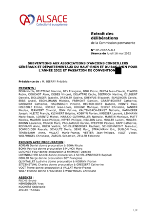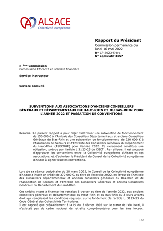 Le présent rapport a pour objet d'attribuer une subvention de fonctionnement de 150 000 € à l’Amicale des Conseillers Départementaux et anciens Conseillers Généraux du Bas-Rhin et une subvention de fonctionnement de 220 000 € à l’Association de Secours et d’Entraide des Conseillers Généraux du Département du Haut-Rhin (ASECOHR) pour l'année 2022. Ce versement constitue une obligation, prévue par l'article L 3123-25 du CGCT . Par ailleurs, il est proposé d'approuver les conventions entre la Collectivité européenne d'Alsace et ces associations, et d'autoriser le Président du Conseil de la Collectivité européenne d'Alsace à signer lesdites conventions.