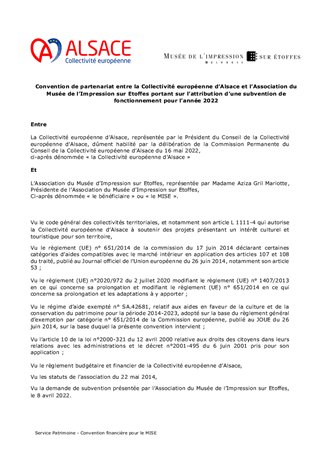 La Collectivité européenne d'Alsace s’est constituée dans l’ambition d’une renaissance institutionnelle d’un territoire culturel et historique. Elle a voté des orientations pour la culture et le rayonnement de l'Alsace au sein desquelles la politique de préservation, restauration, valorisation et mise en tourisme du patrimoine a une place importante comme porteuse de l'identité alsacienne et de l'attractivité du territoire, au service de la marque Alsace . Le présent rapport a pour objet de proposer à la Commission permanente d'attribuer des subventions d'investissement pour le Fonds pour le Patrimoine Emblématique de l'Alsace (FPEA) d'un montant total de 120 106 € et des subventions d'investissement d'un montant total de 350 000 € et de fonctionnement d'un montant total de 733 000 € aux musées partenaires dans le cadre de la politique de soutien à l'animation du patrimoine et d'approuver les termes des projets de conventions financières et de l'avenant n°5 correspondants.