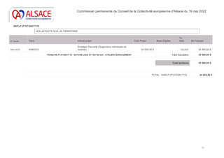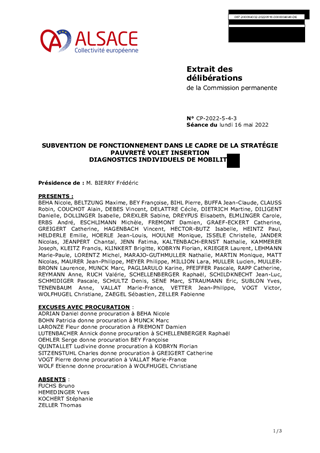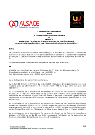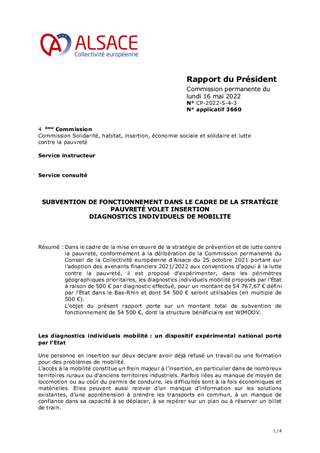 Dans le cadre de la mise en œuvre de la stratégie de prévention et de lutte contre la pauvreté, conformément à la délibération de la Commission permanente du Conseil de la Collectivité européenne d’Alsace du 25 octobre 2021 portant sur l’adoption des avenants financiers 2021/2022 aux conventions d’appui à la lutte contre la pauvreté, il est proposé d’expérimenter, dans les périmètres géographiques prioritaires, les diagnostics individuels mobilité proposés par l’Etat à raison de 500 € par diagnostic effectué, pour un montant de 54 767,67 € défini par l'Etat dans le Bas-Rhin et dont 54 500 € seront utilisables (en multiple de 500 €). L’objet du présent rapport porte sur un montant total de subvention de fonctionnement de 54 500 €, dont la structure bénéficiaire est WIMOOV.