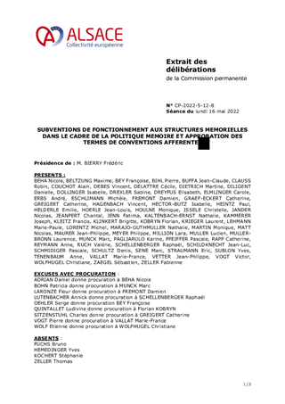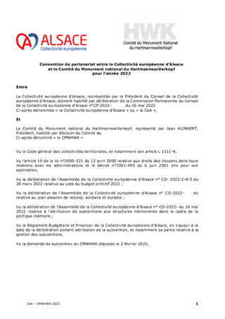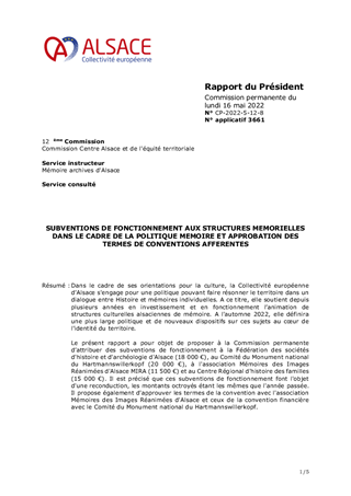 Dans le cadre de ses orientations pour la culture, la Collectivité européenne d’Alsace s'engage pour une politique pouvant faire résonner le territoire dans un dialogue entre Histoire et mémoires individuelles. A ce titre, elle soutient depuis plusieurs années en investissement et en fonctionnement l’animation de structures culturelles alsaciennes de mémoire. A l'automne 2022, elle définira une plus large politique et de nouveaux dispositifs sur ces sujets au cœur de l'identité du territoire. Le présent rapport a pour objet de proposer à la Commission permanente d’attribuer des subventions de fonctionnement à la Fédération des sociétés d'histoire et d'archéologie d'Alsace (18 000 €), au Comité du Monument national du Hartmannswillerkopf (20 000 €), à l'association Mémoires des Images Réanimées d'Alsace MIRA (11 500 €) et au Centre Régional d'histoire des familles (15 000 €). Il est précisé que ces subventions de fonctionnement font l'objet d'une reconduction, les montants octroyés étant les mêmes que l'année passée. Il propose également d'approuver les termes de la convention avec l'association Mémoires des Images Réanimées d'Alsace et ceux de la convention financière avec le Comité du Monument national du Hartmannswillerkopf.