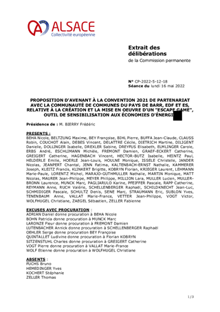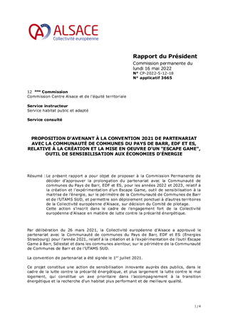 Le présent rapport a pour objet de proposer à la Commission Permanente de décider d’approuver la prolongation du partenariat avec la Communauté de communes du Pays de Barr, EDF et ES, pour les années 2022 et 2023, relatif à la création et l'expérimentation d'un Escape Game, outil de sensibilisation à la maitrise de l’énergie, sur le périmètre de la Communauté de Communes de Barr et de l’UTAMS SUD, et permettre son déploiement ponctuel à d’autres territoires de la Collectivité européenne d’Alsace, sur décision du Comité de pilotage. Cette action s'inscrit dans le cadre de l'engagement fort de la Collectivité européenne d'Alsace en matière de lutte contre la précarité énergétique.