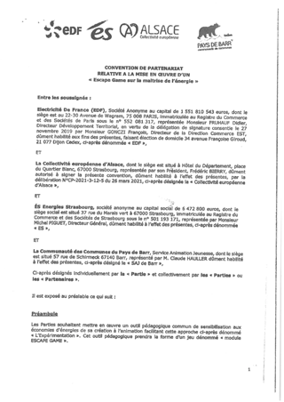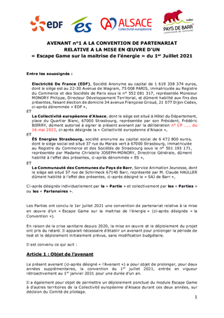 PROPOSITION D'AVENANT À LA CONVENTION 2021 DE PARTENARIAT AVEC LA COMMUNAUTÉ DE COMMUNES DU PAYS DE BARR, EDF ET ES, RELATIVE À LA CRÉATION ET LA MISE EN OEUVRE D'UN "ESCAPE GAME", OUTIL DE SENSIBILISATION AUX ÉCONOMIES D'ÉNERGIE