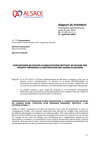 Le 4 avril 2019, le Conseil départemental du Bas-Rhin a adopté un Plan de 10 actions contre l’antisémitisme, le racisme et la haine (CD/2019/008). La Collectivité européenne d'Alsace entend poursuivre ce combat, notamment par un soutien au travail de mémoire, plus particulièrement à destination des jeunes. Le présent rapport a pour objet de proposer à la Commission permanente d’attribuer des subventions de fonctionnement d’un montant total de 3 500 € à plusieurs associations œuvrant dans ce domaine.