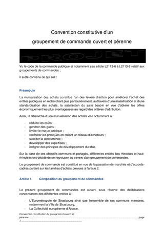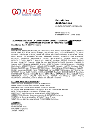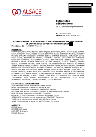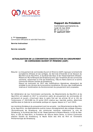 Le Groupement de commandes Ouvert et Pérenne (GOP) regroupe la Collectivité européenne d'Alsace et ses collèges, les Services d'Incendie et de Secours du Bas-Rhin et du Haut-Rhin, le Syndicat des Eaux et de l’Assainissement d’Alsace-Moselle et l’Eurométropole de Strasbourg ainsi que l’ensemble de ses communes membres, notamment la Ville de Strasbourg, l’Œuvre Notre Dame et le Centre Communal d’Action Sociale de Strasbourg. Depuis sa conclusion en 2017 des modifications législatives nécessitent de procéder à une révision de la convention constitutive. De plus, des modifications relatives à l'amélioration du fonctionnement du groupement sont proposées.