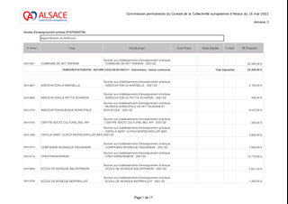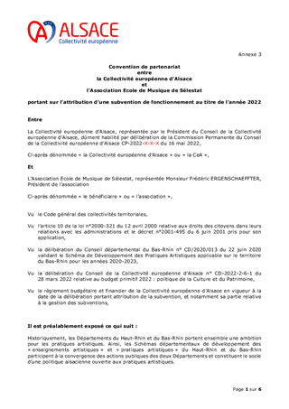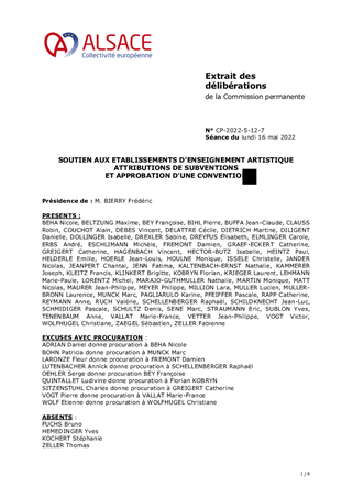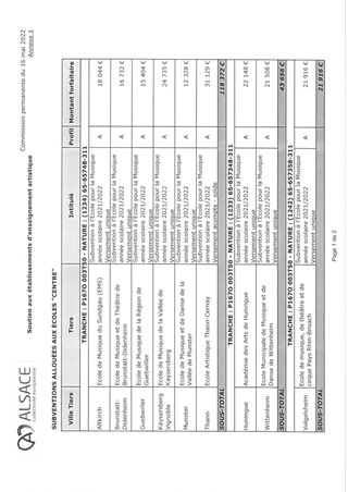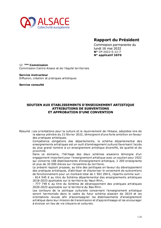 Les orientations pour la culture et le rayonnement de l’Alsace, adoptées lors de la séance plénière du 21 février 2022, témoignent d’une forte ambition en faveur des pratiques artistiques. Compétence obligatoire des départements, le schéma départemental des enseignements artistiques est un outil d’aménagement culturel favorisant l’accès du plus grand nombre à un enseignement artistique diversifié, de qualité et de proximité. Dans ce domaine, l’héritage des deux schémas alsaciens témoigne d’un engagement important pour l’enseignement artistique avec un soutien pour 2022 qui concerne 168 établissements d’enseignement artistique, 1 200 enseignants et plus de 33 000 élèves sur l’ensemble du territoire. Le présent rapport propose, au titre des politiques en faveur du développement des pratiques artistiques, d’attribuer et d’autoriser le versement de subventions de fonctionnement pour un montant total de 1 592 294 €, répartis comme suit : - 814 545 € au titre du Schéma départemental des enseignements artistiques 2018-2023 applicable sur le territoire du Haut-Rhin, - 777 749 € au titre du Schéma de développement des pratiques artistiques 2020-2023 applicable sur le territoire du Bas-Rhin. Les contours de la politique culturelle concernant l’enseignement artistique seront harmonisés dans le cadre du futur schéma alsacien de 2024 et les orientations revues afin d’accompagner les établissements d'enseignement artistique dans leur mission de transmission et d'apprentissage et les encourager à évoluer en lieu de vie citoyens et culturels. Ces dossiers ont fait l'objet d'un avis favorable de la Commission territoriale Centre Alsace et de l’équité territoriale du 5 mai 2022 et des Commissions territoriales du Nord Alsace – Haguenau – Wissembourg du 28 avril 2022, de l’Agglomération de Mulhouse du 9 mai 2022, de la Région de Colmar du 2 mai 2022, de l’Ouest Alsace Saverne – Molsheim du 2 mai 2022, de l’Eurométropole de Strasbourg du 3 mai 2022 et du Sud Alsace du 5 mai 2022.