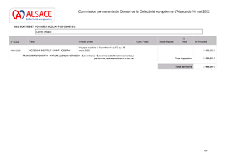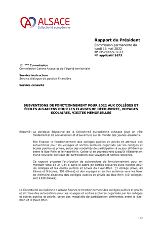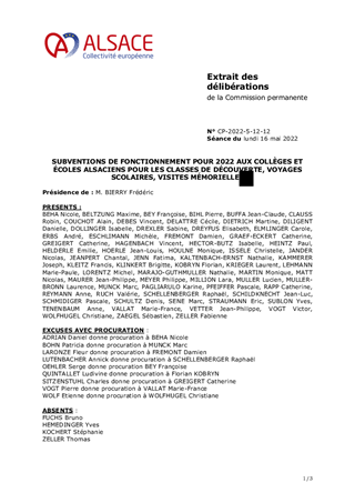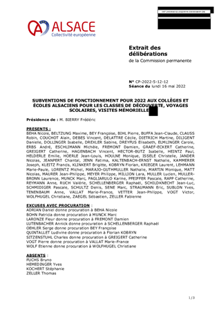 SUBVENTIONS DE FONCTIONNEMENT POUR 2022 AUX COLLÈGES ET ÉCOLES ALSACIENS POUR LES CLASSES DE DÉCOUVERTE, VOYAGES SCOLAIRES, VISITES MÉMORIELLES