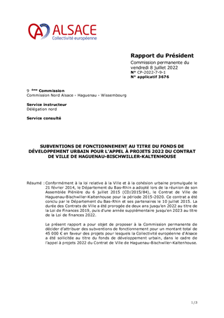 Conformément à la loi relative à la Ville et à la cohésion urbaine promulguée le 21 février 2014, le Département du Bas-Rhin a adopté lors de la réunion de son Assemblée Plénière du 6 juillet 2015 (CD/2015/84), le Contrat de Ville de Haguenau-Bischwiller-Kaltenhouse pour la période 2015-2020. Ce contrat a été conclu par le Département du Bas-Rhin et ses partenaires le 10 juillet 2015. La durée des Contrats de Ville a été prorogée de deux ans jusqu’en 2022 au titre de la Loi de Finances 2019, puis d'une année supplémentaire jusqu'en 2023 au titre de la Loi de finances 2022. Le présent rapport a pour objet de proposer à la Commission permanente de décider d’attribuer des subventions de fonctionnement pour un montant total de 45 000 € en faveur des projets pour lesquels la Collectivité européenne d'Alsace a été sollicitée au titre du fonds de développement urbain, dans le cadre de l'appel à projets 2022 du Contrat de Ville de Haguenau-Bischwiller-Kaltenhouse.