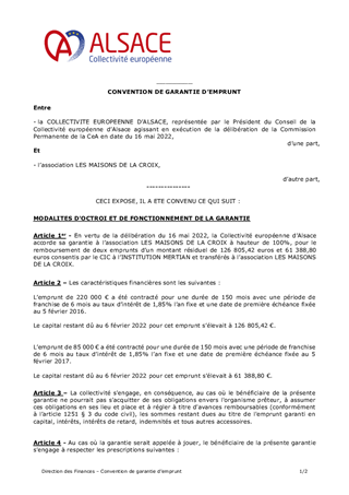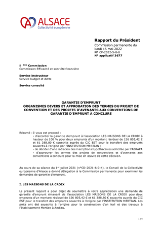 Il vous est proposé : - d’accorder la garantie d'emprunt à l’association LES MAISONS DE LA CROIX à hauteur de 100 % pour deux emprunts d’un montant résiduel de 126 805,42 € et 61 388,80 € souscrits auprès du CIC EST pour le transfert des emprunts souscrits à l’origine par l’INSTITUTION MERTIAN ; - de décider d’une radiation des inscriptions hypothécaires sollicitée par l’ABRAPA - d’approuver les termes des projets de conventions et d’avenants aux conventions à conclure pour la mise en œuvre de cette décision.