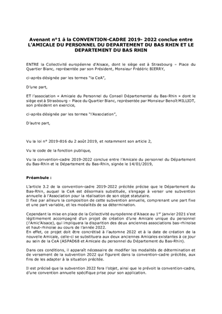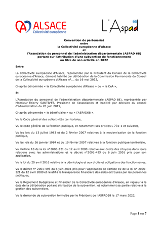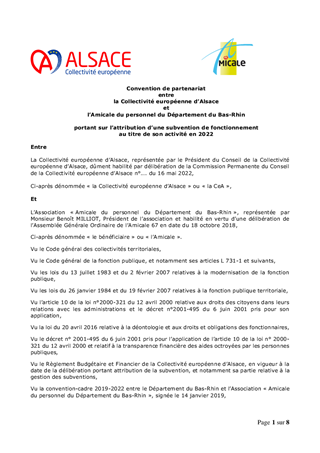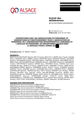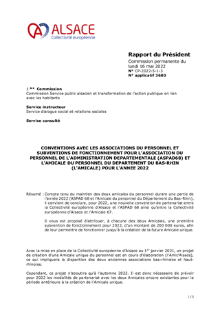 Compte tenu du maintien des deux amicales du personnel durant une partie de l’année 2022 (ASPAD 68 et l’Amicale du personnel du Département du Bas-Rhin), il convient de conclure, pour 2022, une nouvelle convention de partenariat entre la Collectivité européenne d'Alsace et l’ASPAD 68 ainsi qu’entre la Collectivité européenne d'Alsace et l’Amicale 67. Il vous est proposé d’attribuer, à chacune des deux Amicales, une première subvention de fonctionnement pour 2022, d’un montant de 200 000 euros, afin de leur permettre de fonctionner jusqu’à la création de la future Amicale unique.