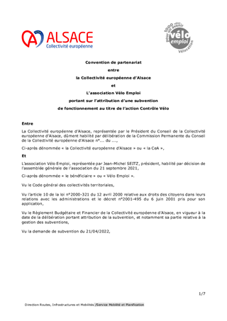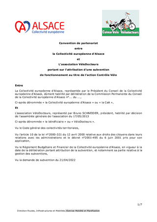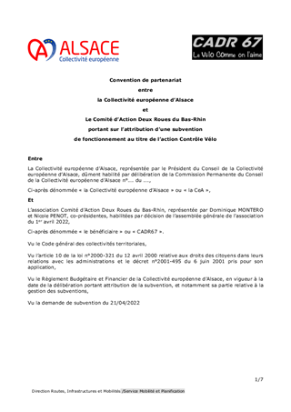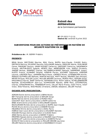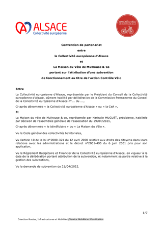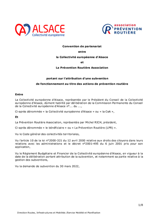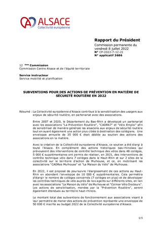 La Collectivité européenne d’Alsace contribue à la sensibilisation des usagers aux enjeux de sécurité routière, en partenariat avec des associations. Entre 2007 et 2020, le Département du Bas-Rhin a développé un partenariat avec les associations "La Prévention Routière", "CADR67" et "Vélo Emploi" afin de sensibiliser de manière générale les alsaciens aux enjeux de sécurité routière tout en ayant également une action plus ciblée à destination des collégiens. Une enveloppe annuelle de 35 000 € était dédiée au soutien des actions des associations en la matière. Avec la création de la Collectivité européenne d’Alsace, ce soutien a été élargi à toute l’Alsace. En complément des actions historiques bas-rhinoises qui prévoyaient des interventions de contrôle technique des vélos dans 48 collèges, 5 000 € supplémentaires ont permis de réaliser, en 2021, des interventions de contrôle technique vélo dans 7 collèges dans le Haut-Rhin et sur 2 sites de la collectivité sur le territoire d’action de Mulhouse, et ce, en mobilisant les associations "CADRes Mulhouse" et "La Maison du Vélo" de Mulhouse. En 2022, il est proposé de poursuivre l’élargissement de ces actions au Haut-Rhin en abondant l’enveloppe de 10 000 € supplémentaires. Cela permettra d’élargir le nombre de collèges concernés (7 collèges en plus) et de développer les contrôles techniques de vélo auprès de nos agents sur différents sites, en lien avec les associations "La Maison du Vélo" de Mulhouse et "Colmar Vélo Docteurs". Les actions de sensibilisation, menées par la "Prévention Routière", seront également étendues au territoire haut-rhinois. Le montant total des subventions de fonctionnement aux associations visant à leur permettre de mener des actions de prévention représente une enveloppe de 50 000 € inscrite au budget 2022 de la Collectivité européenne d’Alsace.