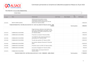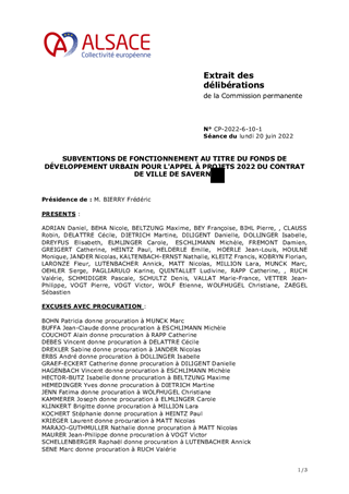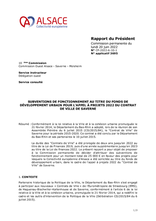Conformément à la loi relative à la Ville et à la cohésion urbaine promulguée le 21 février 2014, le Département du Bas-Rhin a adopté, lors de la réunion de son Assemblée Plénière du 6 juillet 2015 (CD/2015/84), le "Contrat de Ville" de Saverne pour la période 2015-2020. Ce contrat a été conclu par le Département du Bas-Rhin et ses partenaires le 10 juillet 2015. La durée des "Contrats de Ville" a été prorogée de deux ans jusqu’en 2022 au titre de la Loi de Finances 2019, puis d'une année supplémentaire jusqu'en 2023 au titre de la Loi de finances 2022. Le présent rapport a pour objet de proposer à la Commission permanente de décider d’attribuer des subventions de fonctionnement pour un montant total de 25 000 € en faveur des projets pour lesquels la Collectivité européenne d'Alsace a été sollicitée au titre du fonds de développement urbain, dans le cadre de l'appel à projets 2022 du "Contrat de Ville" de Saverne.