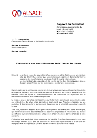Le présent rapport a pour objet d'approuver une série d'aides, pour un montant total de 89 200 €, à verser aux associations qui organisent dans les territoires alsaciens des manifestations sportives d'intérêt local à international. Les montants d'aide proposés ont été validés par les élus thématiques en charge du sport et confirmés par les commissions territoriales concernées.