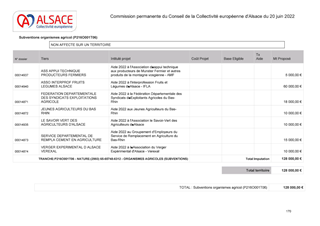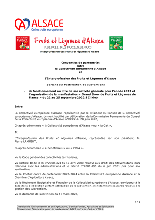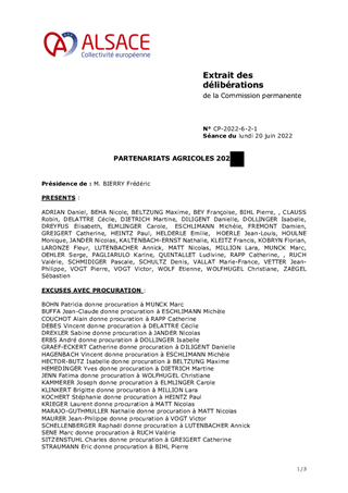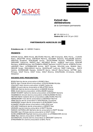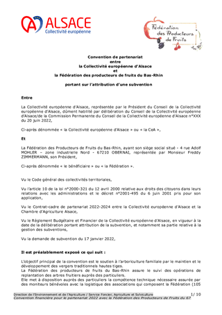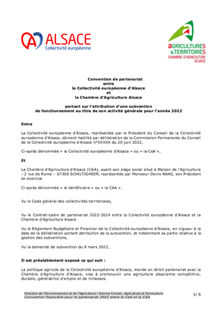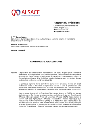 L’agriculture et l'arboriculture représentent un enjeu majeur pour l’économie alsacienne, mais également pour l’aménagement, le dynamisme et la diversité du territoire. Ils produisent nos aliments, entretiennent nos paysages, créent de l’emploi et contribuent à la vitalité de nos territoires ruraux. Les enjeux de ces partenariats sont donc nombreux et variés. La politique agricole de la Collectivité européenne d’Alsace, menée en étroit partenariat avec la Chambre d’Agriculture Alsace - vise à promouvoir une agriculture alsacienne compétitive, durable, respectueuse de l'environnement, génératrice d’emploi et de richesses - s'inscrit dans un contrat cadre 2022-2024. Il est proposé de soutenir la Chambre d'Agriculture Alsace, la FDSEA, les Jeunes Agriculteurs, le Service de remplacement en agriculture, le Verger Expérimental d'Alsace, l'Interprofession Fruits et Légumes d'Alsace (IFLA), l'association le Savoir Vert des Agriculteurs d'Alsace, l'Association d'appui technique aux producteurs de Munster Fermier (AMF) et la Fédération des arboriculteurs du Bas-Rhin pour un montant total de 986 090 € pour l'année 2022 et de prolonger la durée de validité de la subvention accordée en 2017 à l'Association Foncière Pastorale "Grand Roué - Tifarupt" pour des travaux de rénovation pastorale.