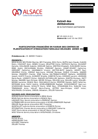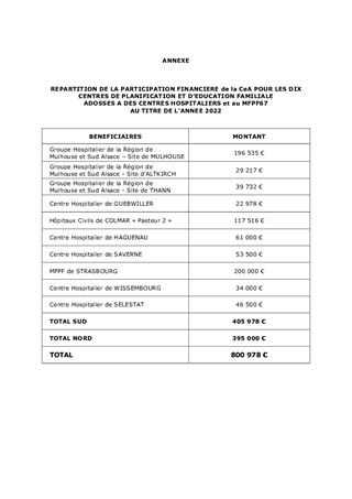 Pour l’année 2022, il est proposé d’accorder une participation financière de 800 978 euros pour assurer le fonctionnement des dix Centres de Planification et d’Education Familiale (CPEF) pour le compte de la Collectivité européenne d’Alsace (CeA).