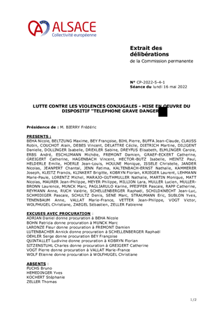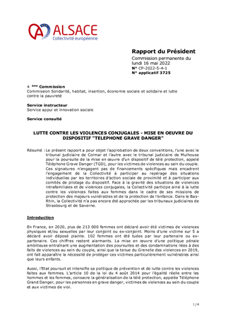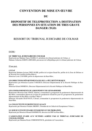 Le présent rapport a pour objet l'approbation de deux conventions, l’une avec le tribunal judiciaire de Colmar et l’autre avec le tribunal judiciaire de Mulhouse pour la poursuite de la mise en œuvre d’un dispositif de télé protection, appelé Téléphone Grave Danger (TGD), pour les victimes de violences au sein du couple. Ces signatures n’engagent pas de financements spécifiques mais encadrent l’engagement de la Collectivité à participer au repérage des situations individuelles par les territoires d’action sociale de proximité et à participer aux comités de pilotage du dispositif. Face à la gravité des situations de violences intrafamiliales et de violences conjugales, la Collectivité participe ainsi à la lutte contre les violences faites aux femmes dans le cadre de ses missions de protection des majeurs vulnérables et de la protection de l’enfance. Dans le Bas-Rhin, la Collectivité n’a pas encore été approchée par les tribunaux judiciaires de Strasbourg et de Saverne.