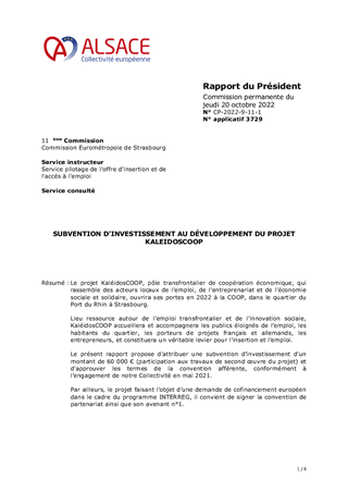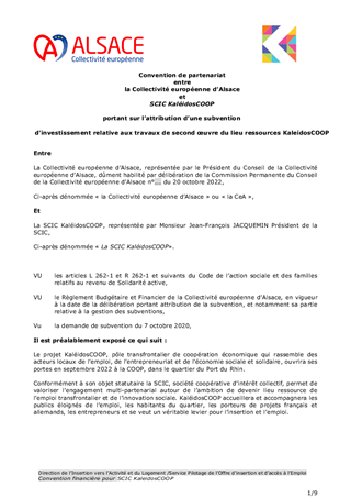 Le projet KaléidosCOOP, pôle transfrontalier de coopération économique, qui rassemble des acteurs locaux de l’emploi, de l’entreprenariat et de l’économie sociale et solidaire, ouvrira ses portes en 2022 à la COOP, dans le quartier du Port du Rhin à Strasbourg. Lieu ressource autour de l’emploi transfrontalier et de l’innovation sociale, KaléidosCOOP accueillera et accompagnera les publics éloignés de l’emploi, les habitants du quartier, les porteurs de projets français et allemands, les entrepreneurs, et constituera un véritable levier pour l’insertion et l’emploi. Le présent rapport propose d'attribuer une subvention d’investissement d'un montant de 60 000 € (participation aux travaux de second œuvre du projet) et d'approuver les termes de la convention afférente, conformément à l’engagement de notre Collectivité en mai 2021. Par ailleurs, le projet faisant l’objet d’une demande de cofinancement européen dans le cadre du programme INTERREG, il convient de signer la convention de partenariat ainsi que son avenant n°1.