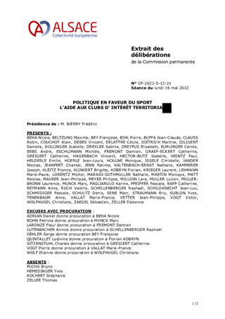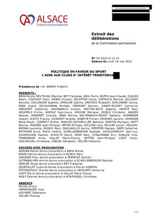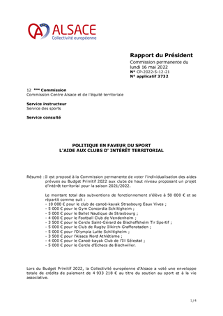 Il est proposé à la Commission permanente de voter l'individualisation des aides prévues au Budget Primitif 2022 aux clubs de haut niveau proposant un projet d’intérêt territorial pour la saison 2021/2022. Le montant total des subventions de fonctionnement s'élève à 50 000 € et se répartit comme suit : - 10 000 € pour le club de canoë-kayak Strasbourg Eaux Vives ; - 5 000 € pour le Gym Concordia Schiltigheim ; - 5 000 € pour le Ballet Nautique de Strasbourg ; - 4 000 € pour le Football Club de Vendenheim ; - 3 500 € pour le Cercle Saint-Gérard de Bischoffsheim Tir Sportif ; - 5 000 € pour le Club de Rugby Illkirch-Graffenstaden ; - 5 000 € pour l’Olympia Lutte Schiltigheim ; - 3 500 € pour l’Alsace Nord Athlétisme ; - 4 000 € pour le Canoë-kayak Club de l'Ill Sélestat ; - 5 000 € pour le Cercle d'Echecs de Bischwiller.