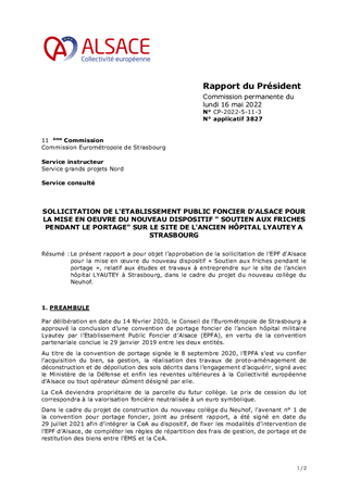 Le présent rapport a pour objet l’approbation de la sollicitation de l'EPF d'Alsace pour la mise en œuvre du nouveau dispositif « Soutien aux friches pendant le portage », relatif aux études et travaux à entreprendre sur le site de l’ancien hôpital LYAUTEY à Strasbourg, dans le cadre du projet du nouveau collège du Neuhof.
