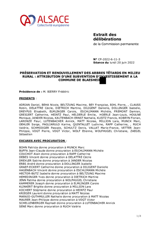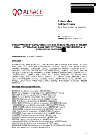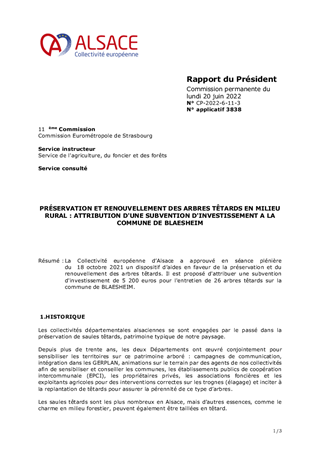 La Collectivité européenne d’Alsace a approuvé en séance plénière du 18 octobre 2021 un dispositif d’aides en faveur de la préservation et du renouvellement des arbres têtards. Il est proposé d'attribuer une subvention d'investissement de 5 200 euros pour l'entretien de 26 arbres têtards sur la commune de BLAESHEIM.